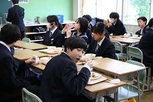 2026年4月13日 13時00分待ちに待った給食がスタートしました。記念すべき1日目はなんとカレー。おいしい給食には笑顔が合います。3年生の教室をのぞくと、給食を片付けた後に勉強している生徒が何人もいます。また、生徒会も動き出しています。新年度少しずつ加速しています。